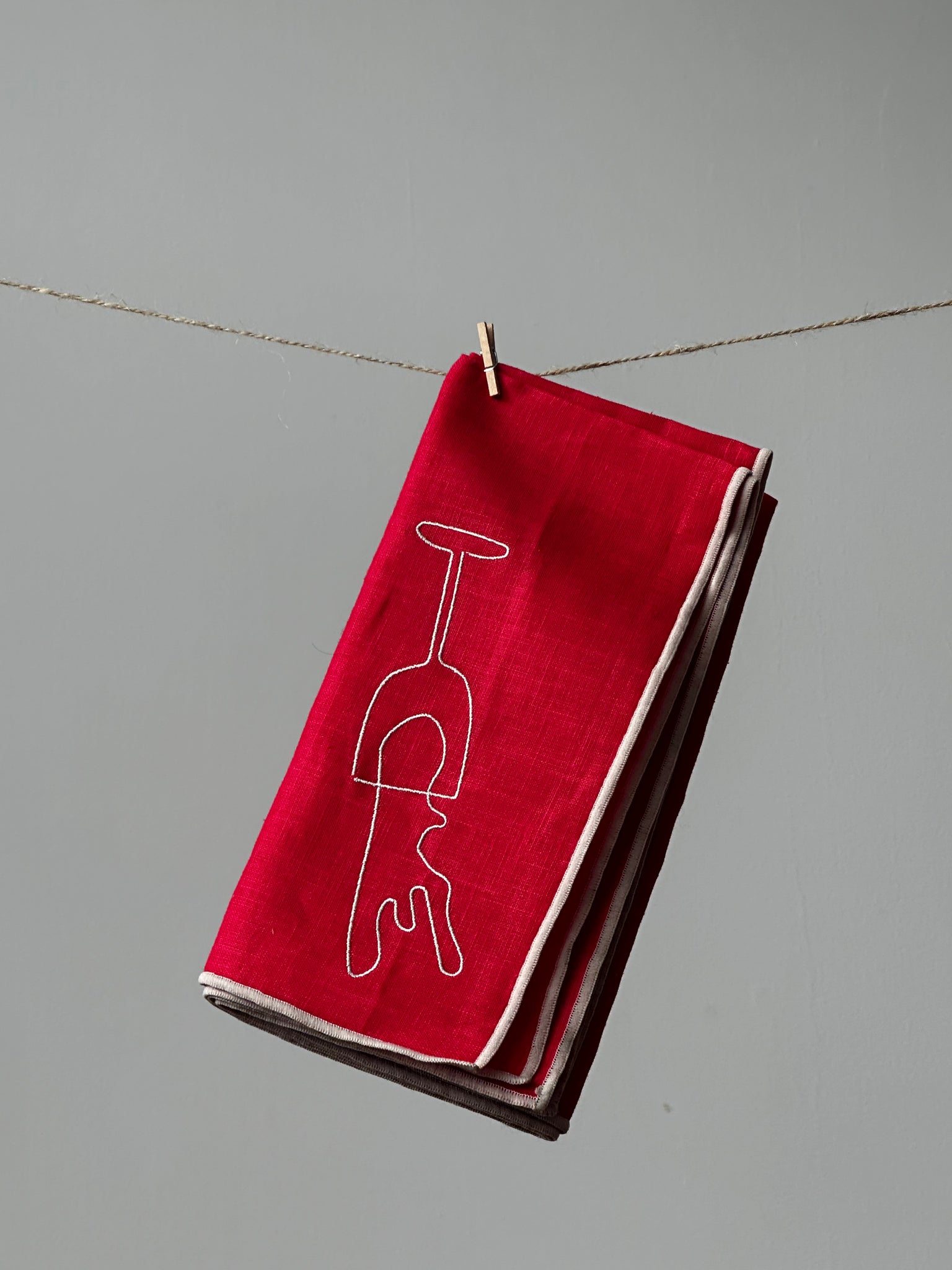 Deze linnen servetten van Maegen zijn een speelse ode aan tafelmomenten die niet perfect hoeven te zijn. De geborduurde afbeelding van een uitgelopen glas wijn geeft meteen karakter aan je tafelsetting — een knipoog voor wie weet dat de leukste avonden soms een klein ‘oeps’-momentje bevatten.