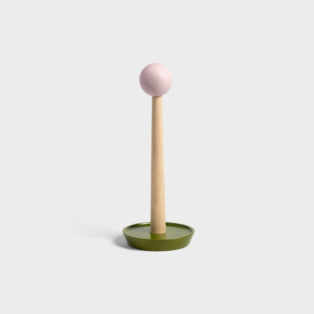 Gemaakt uit FSC-gecertificeerd rubberhout voelt hij stevig en natuurlijk aan, met een warme uitstraling die mooi combineert met de kleurrijke accenten van het ontwerp. De vorm is eenvoudig, maar net eigenzinnig genoeg om op te vallen zonder te overheersen. Functioneel blijft hij minstens even sterk: de bovenkant kan je makkelijk verwijderen om een nieuwe rol te plaatsen, en houdt alles netjes op zijn plek tijdens gebruik.