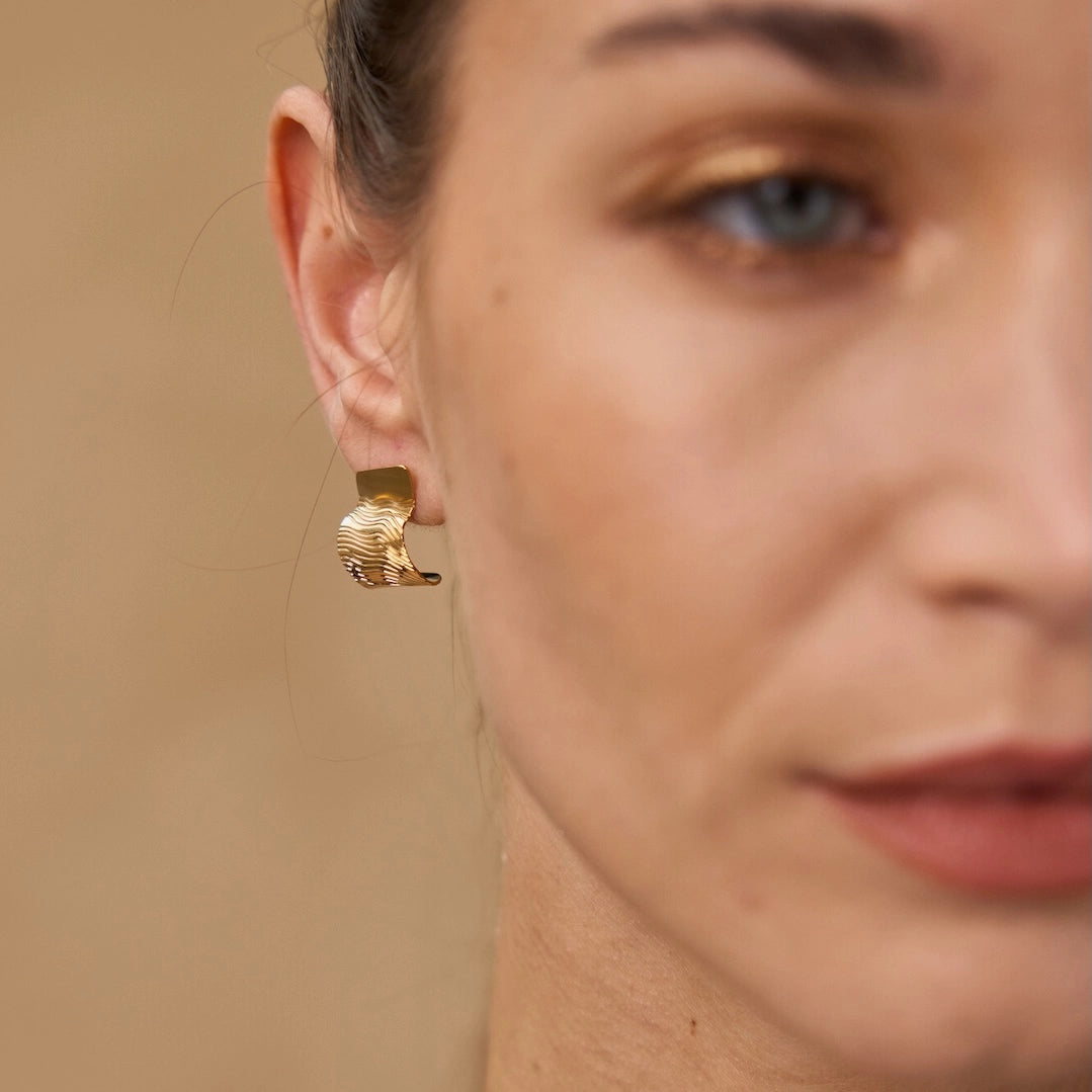 Deze atypische oorbellen uit de Totem-collectie van Nadja Carlotti zijn ultra vrouwelijk, elegant en uitgesproken. Het motief is geïnspireerd op de structuur van geweven draden - de schering en de inslag, vertaald naar een krachtig, organisch ontwerp. De asymmetrische vormgeving volgt subtiel het oor en geeft deze oorbellen hun gedurfde, unieke uitstraling.