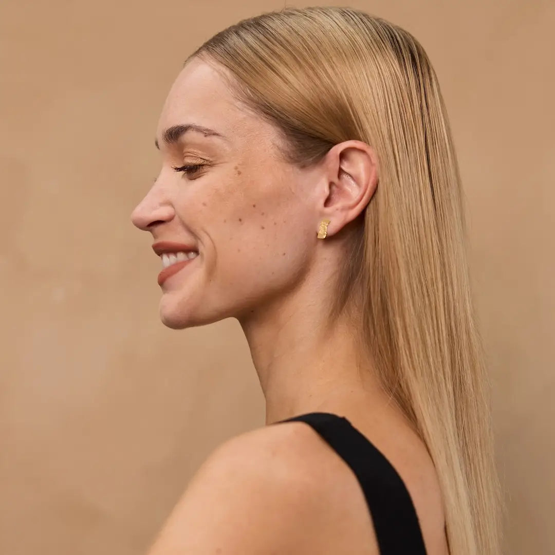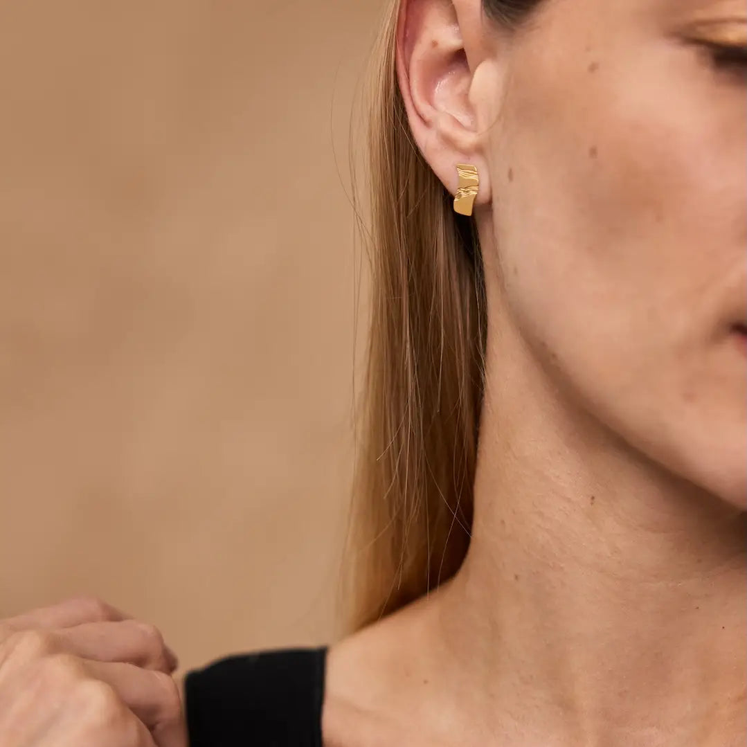 Deze kleine Totem-oorbellen zijn subtiel, maar allesbehalve saai. Het asymmetrische motief is geïnspireerd op geweven draden en krijgt extra diepte door het gegraveerde, licht gestreepte oppervlak. Daardoor vangt het metaal het licht op een zachte, bijna vibrerende manier.