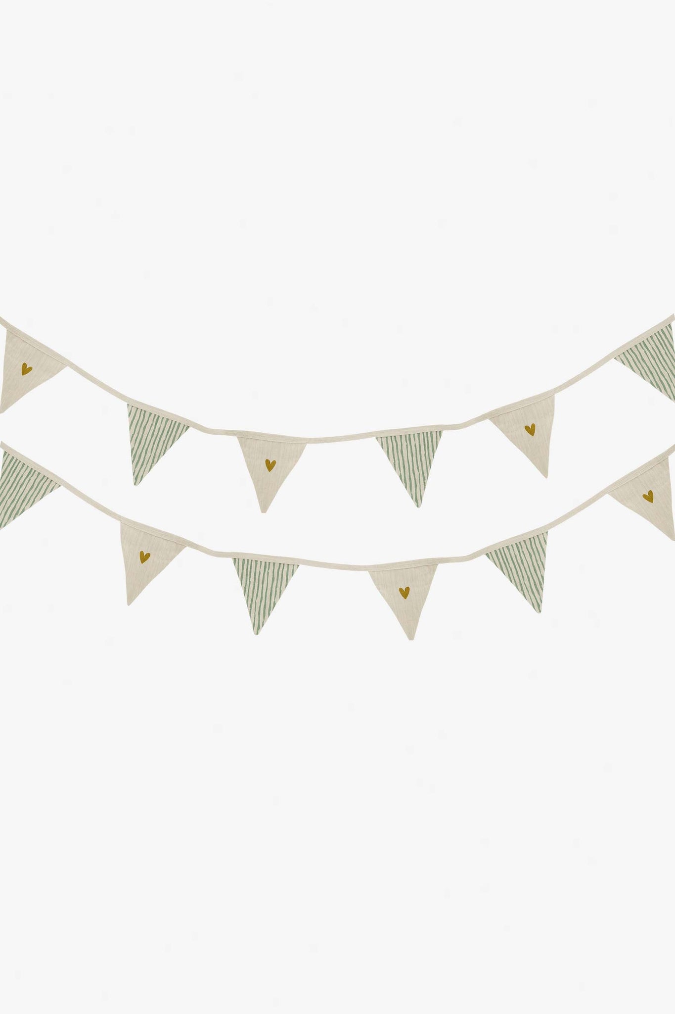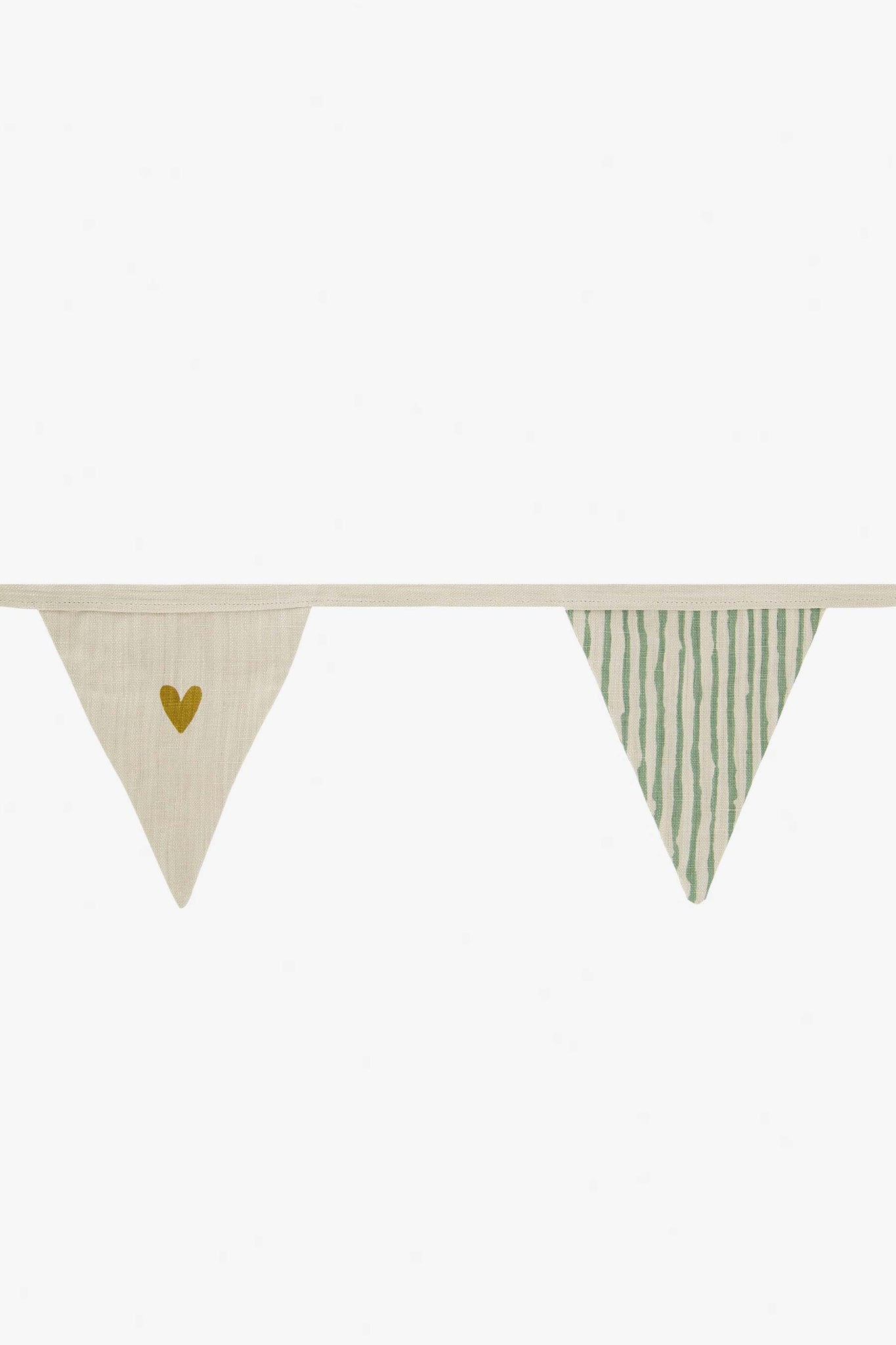 Met deze vlaggenlijn van Zusss in huis is het meteen feest! Twee verschillende vlaggetjes wisselen elkaar af: eentje met een hartje en saliegroene streepjes. Hij is gemaakt van 50% katoen en 50% linnen. De slinger is 650 centimeter lang, zo hang je 'm door je hele huis!