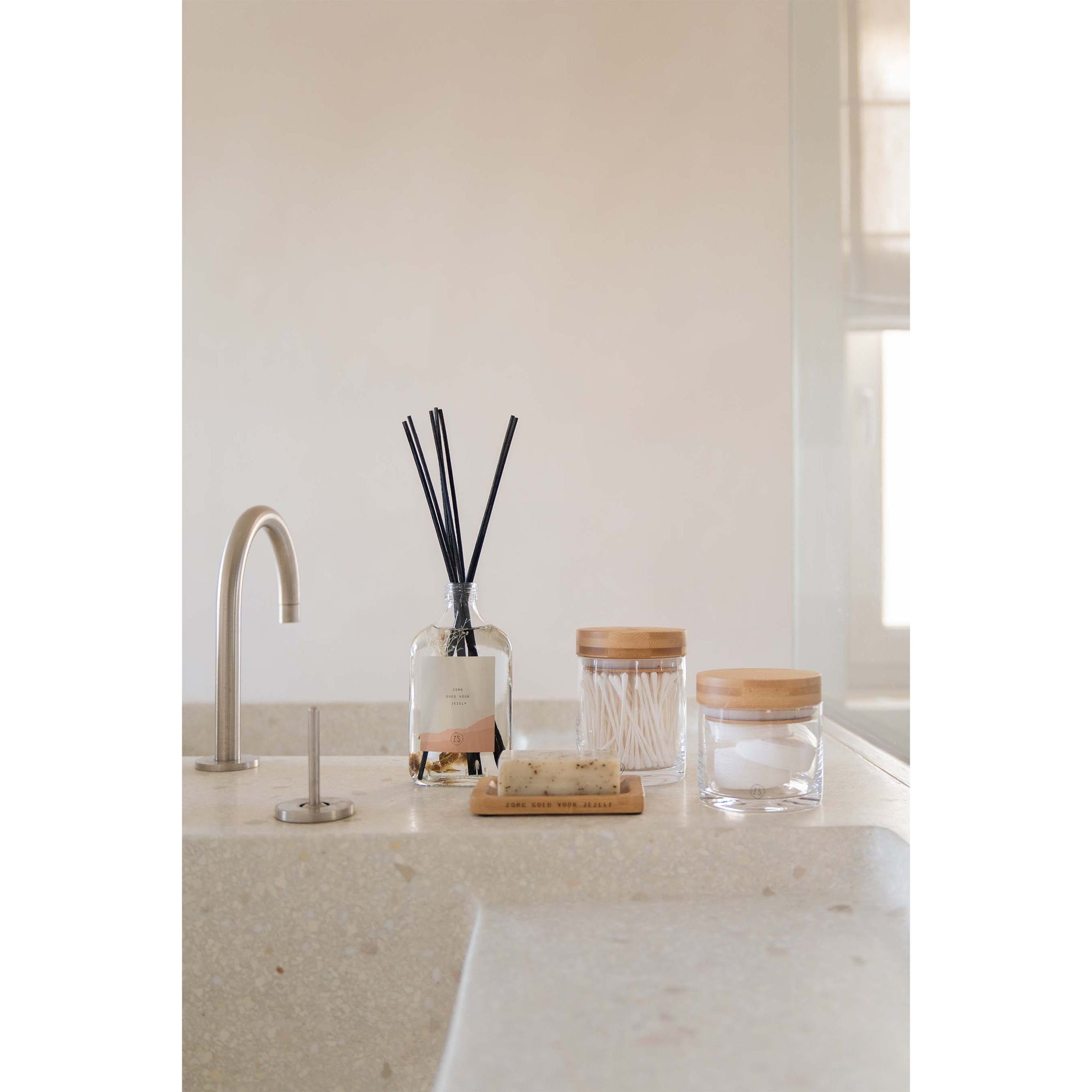 Hoe mooi is deze schattige voorraadpot van Zusss met houten dekseltje? Op het deksel staat "Zorg goed voor jezelf". Je maakt er je badkamer mooier en netter mee. Hij is praktisch in gebruik voor het opbergen van allerhande spulletjes zoals wattenschijfjes of haaraccessoires.