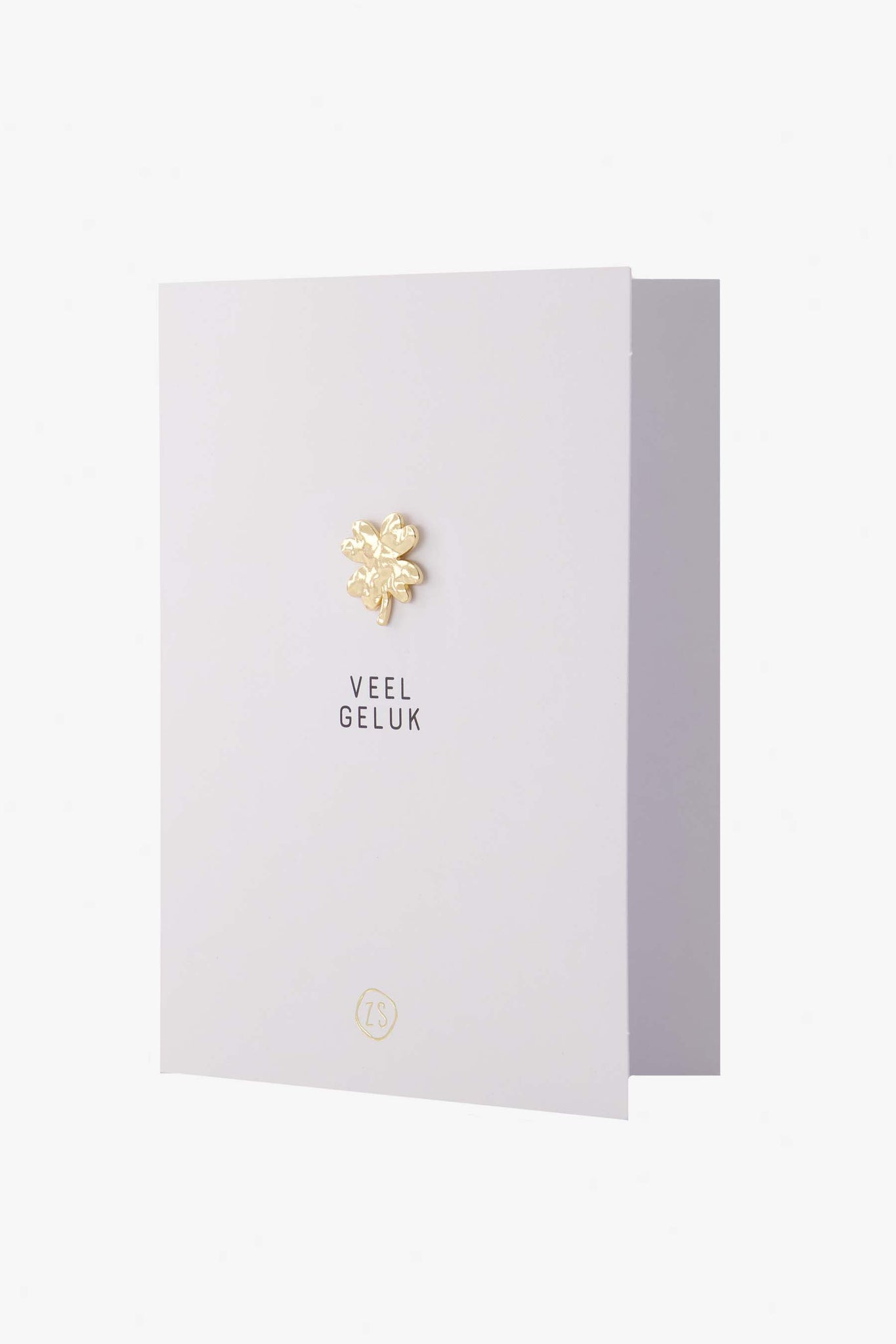 Met een hartverwarmende Zusss kaart tover je moeiteloos een glimlach op iemands gezicht! Deze witte wenskaart is versierd met een schitterende goudkleurige broche in de vorm van een klavertje vier en is bedrukt met de tekst "veel geluk".